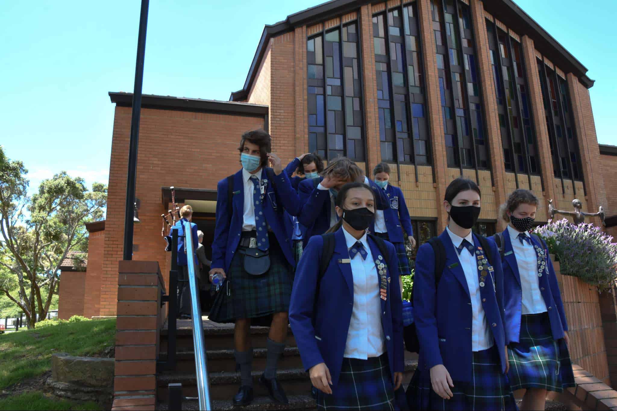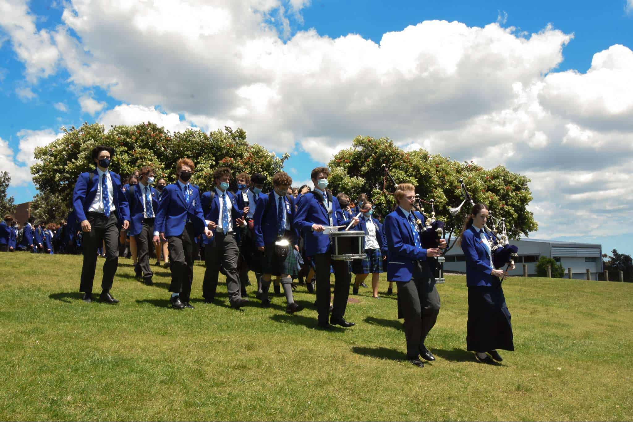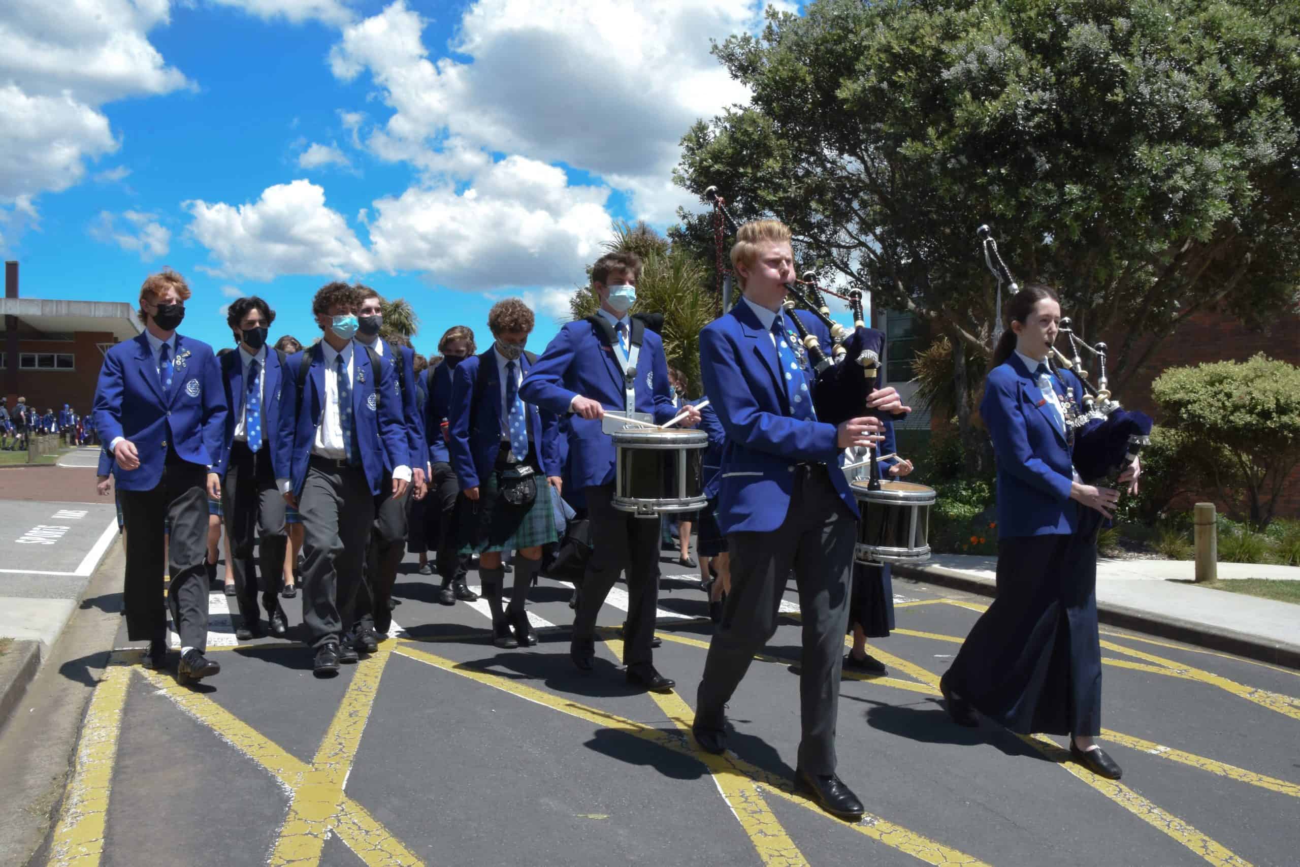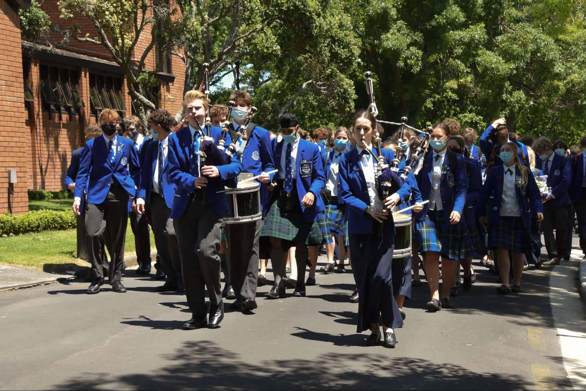 November 11 marked the official last day of school for our Year 13 students. While they spent the morning in classrooms with their teachers and peers preparing for their upcoming exams, our Year 13 cohort came together in the afternoon to celebrate their learning journey at Saint Kentigern, a place that has been ‘home’ to a number of them since their primary school years. The Graduation afternoon started with a Chapel service delivered by College Chaplain Reverend Smith, before students were led by fellow Year 13 pipers, Cameron Dean and Charlotte Cornwall, and drummers, Sarina Wang and Nic Lacey, to the No 1 Sports Field for the annual tradition of forming a giant ‘human 2021′ for an aerial photo, representing the graduating Class of 2021.