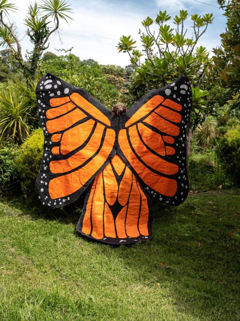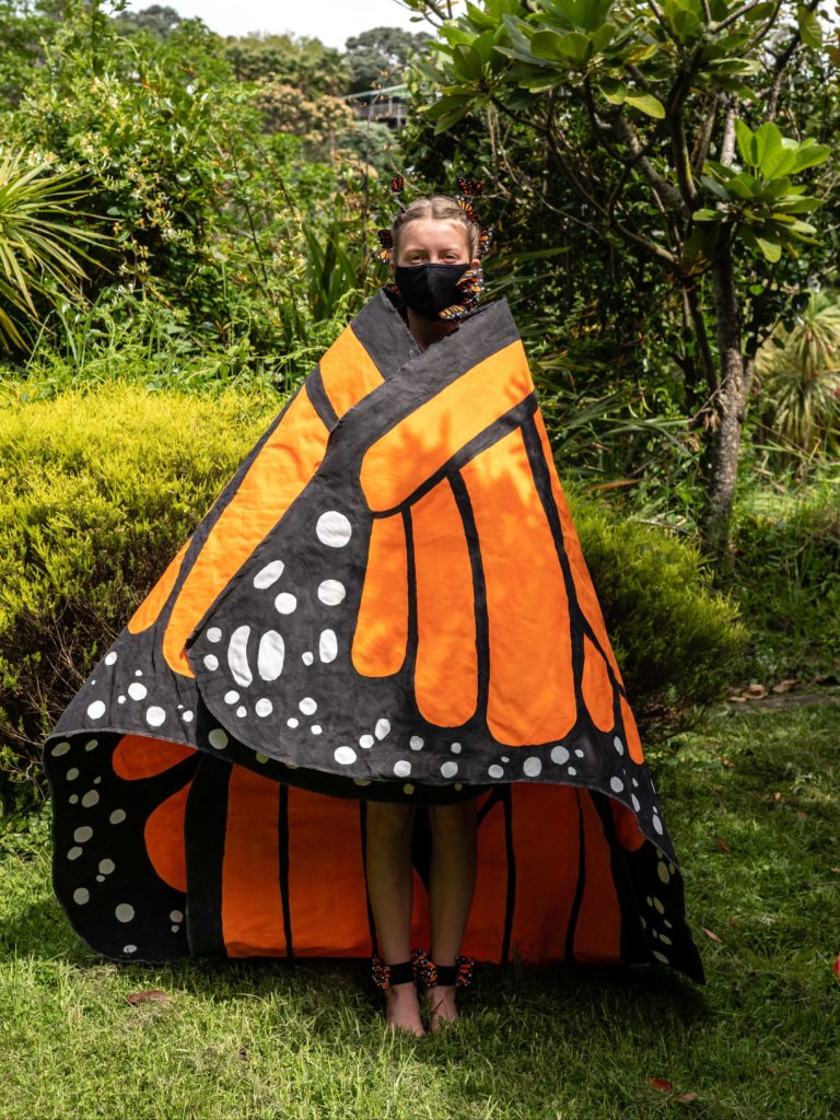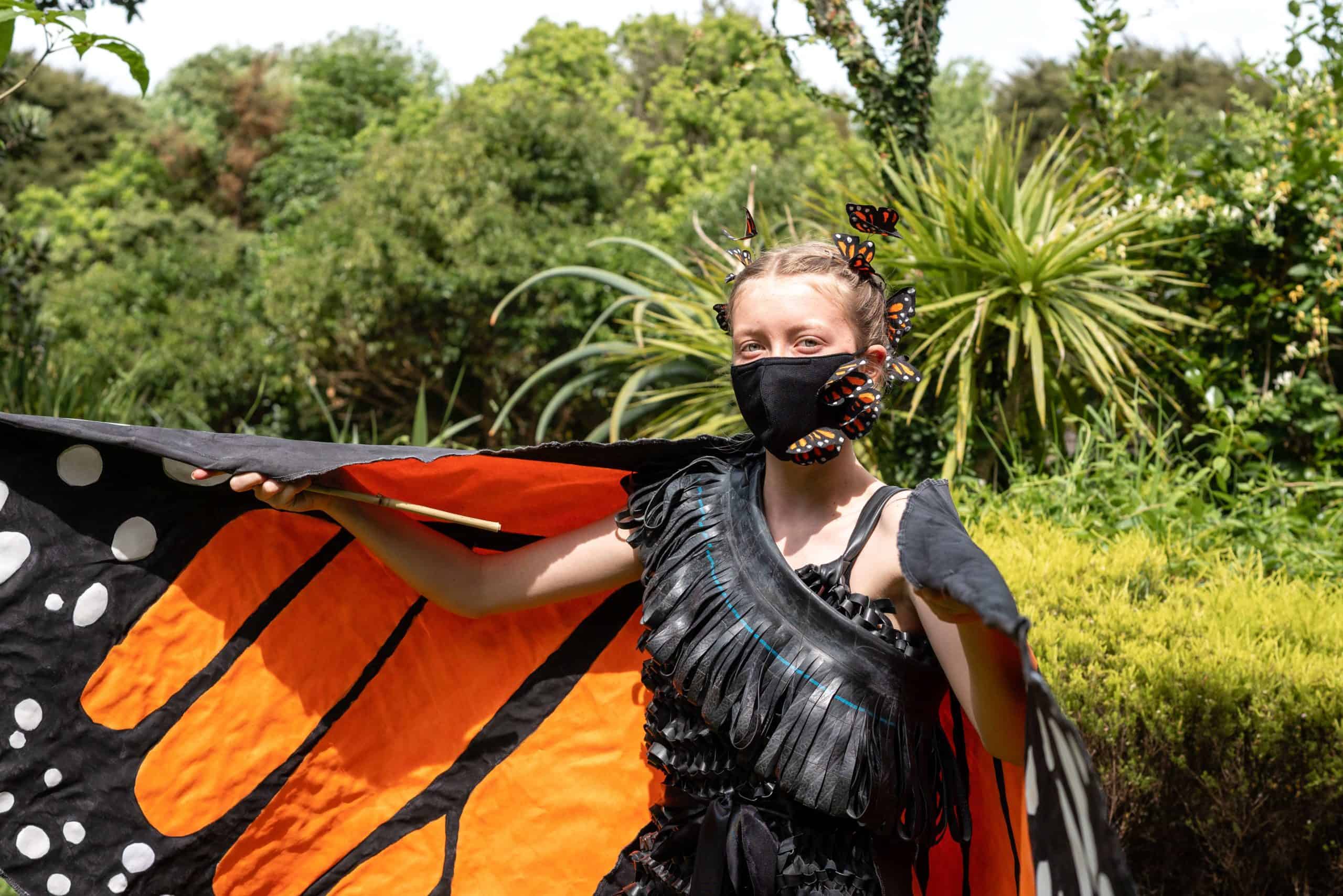 Sophie’s creation transforms from a wrapped-up cape shaped as a chrysalis into a majestic butterfly when the pair of giant wings spread open. The outfit is painstakingly hand painted with old paint and sewn together over six months showcasing a striking deep orange butterfly with prominent black veins and white patterns along the edges. Her design comes complete with a reusable mask with handmade butterflies sewn on them.