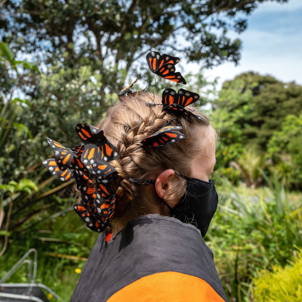Sophie’s latest design, Transformation Creation which was created for the Colleges Wearable Arts Showcase this year, was inspired by her late grandmother who loved Monarch butterflies. Sophie explained, “My nana loved gardens. She would always have plants that attracted butterflies. I grew up drawing different species of butterfly pictures and my nana would pin them up on a wall. When I was coming up for this year’s idea, I envisioned a beautiful butterfly, the same way I remember my Nana. In fact, the background around my outfit is a creation I designed for my nana in 2018 but never got around to making it.”