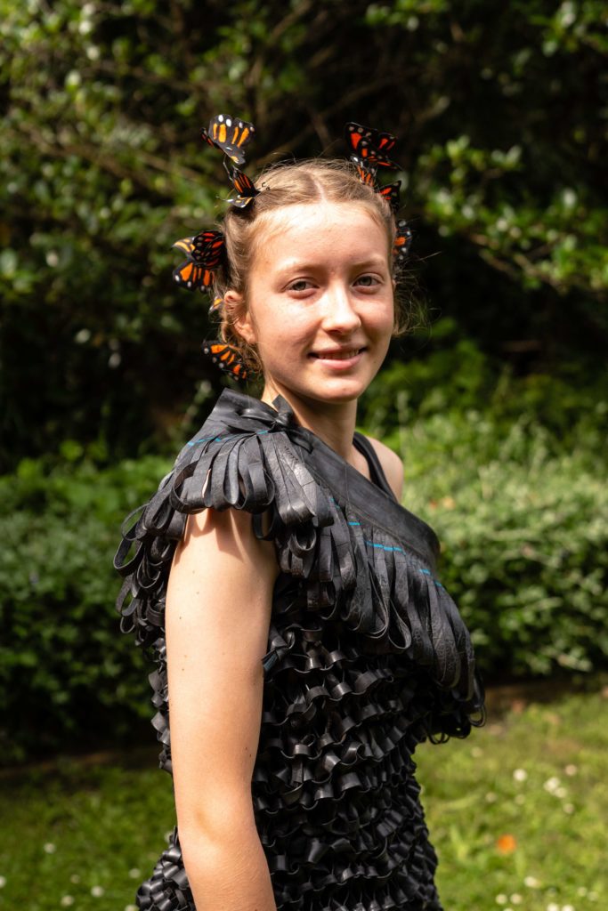 One of the key features of Sophie’s creation is the intricate detail she added to her outfit. The giant wings and the smaller ones were painted over several times on each side to harden the surface. Her biggest challenge was to knit the inner tubes for the body of the butterfly as the rubber would stick to the needle. Sophie eventually found a way to ease the process using powder.