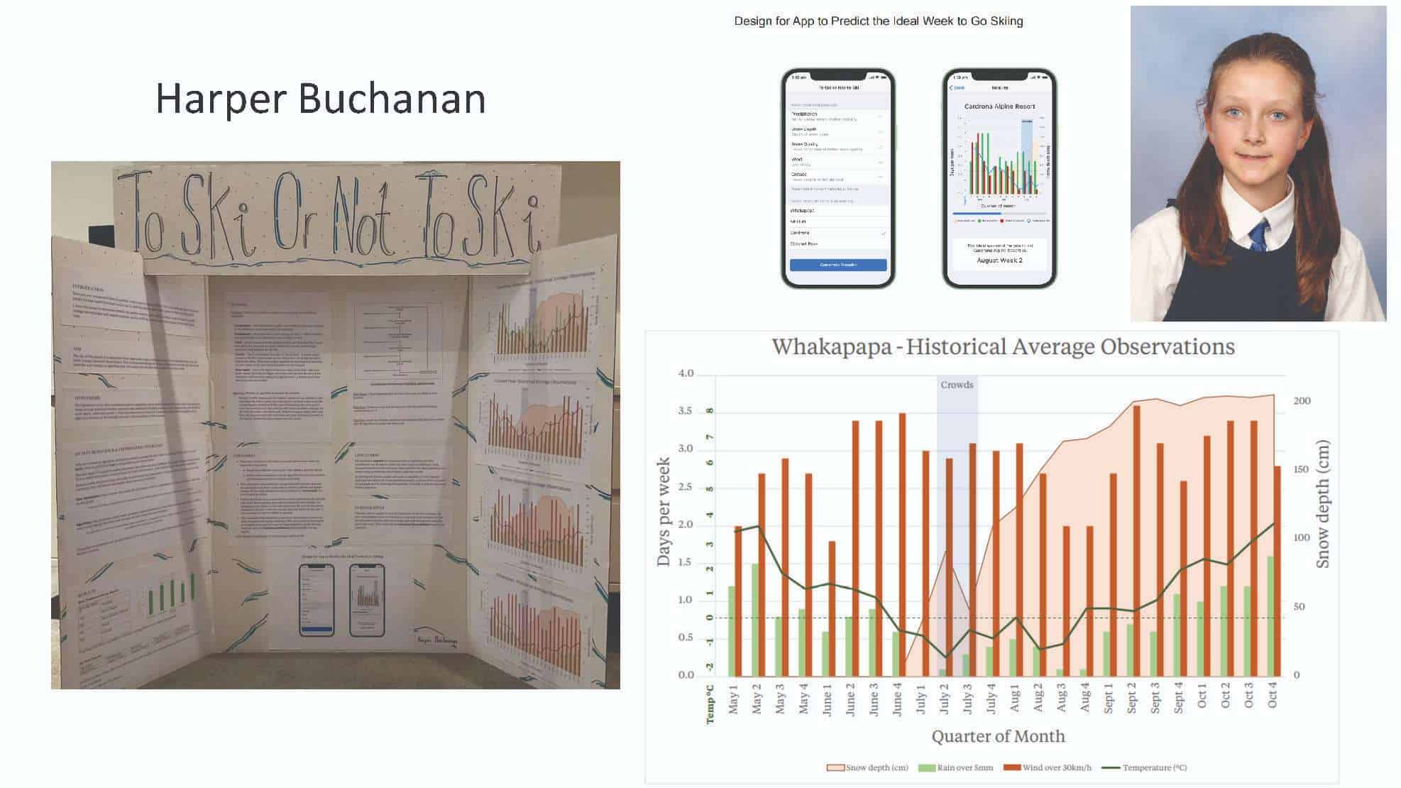 Placed First in the Human Behaviour category, Ava Van Rij’s project ‘Noise’ pondered the question of whether additional noise could impede concentration and the ability for students to focus or perform in routine maths tasks or questions. Her project was also awarded two Special Prizes. Awarded First Place in the Research category, Harper Buchanan’s project, ‘To ski or not to ski’ researched various data sets regarding good snow days to find the optimum day for skiing. Following her study, she proposed a design for an app for the perfect snow day. Harper was also rewarded with a Special Prize.